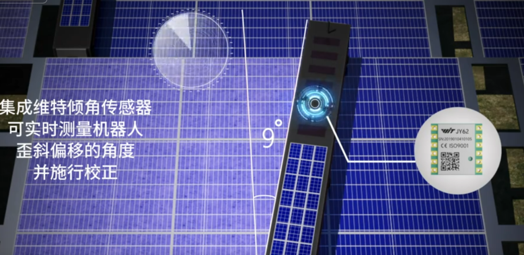 - 传感器作用:机器人集成姿态传感器(如维特智能 JY901S、JY60、HWT101CT),实时采集运行过程中的加速度值、角速度值,计算机器人相对于光伏板平面的方位角、倾斜角度(歪斜状态)。